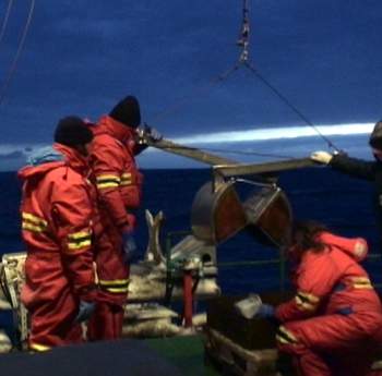 Esta draga la diseñó Martin Rauschert, un naturalista alemán que trabaja activamente en taxonomía y distribución de crustáceos anfípodos en la Antártida, y que reúne desde hace años un catálogo fotográfico de animales antárticos. A la izquierda podéis ver como suben la draga Rauschert tirando de las cadenas que la atan a la Agassiz. |