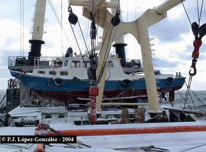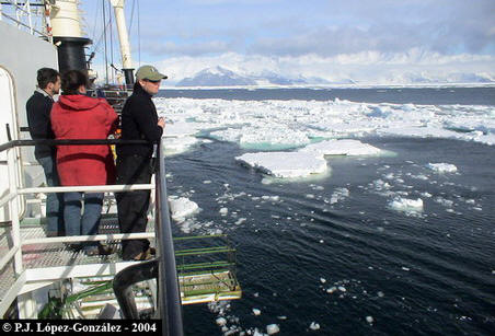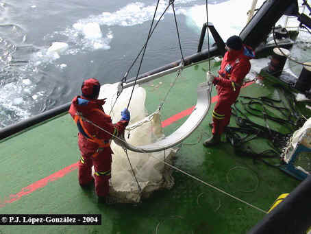 Dejamos la estación y nos dirigimos al primer punto de muestreo. Encontramos por el camino algunas placas de hielo, pero esto no es impedimento para el Italica. En la cubierta de popa se ponen a punto las artes de pesca y muestreo para que todo salga correctamente y, así, todos podamos obtener los organismos que necesitamos para nuestro estudio. |