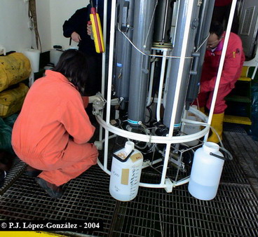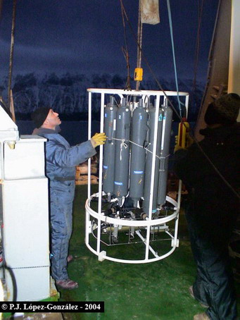 Rossett Este equipo es habitual en las campañas donde se estudie los organismos de la columna de agua o su actividad. Aquí podemos ver un conjunto de botellas Niskin que pueden ser cerradas desde el barco para recoger agua a la profundidad que deseemos. El conjunto lleva asociado un CDT que aportará datos de temperatura y conductividad durante el descenso y el ascenso del equipo. Una vez en cubierta, el agua es recogida por unas espitas en la base de las botellas, y en los laboratorios ésta es filtrada convenientemente para los distintos estudios que se deseen realizar (clorofilas, sólidos en suspensión, etc...). |