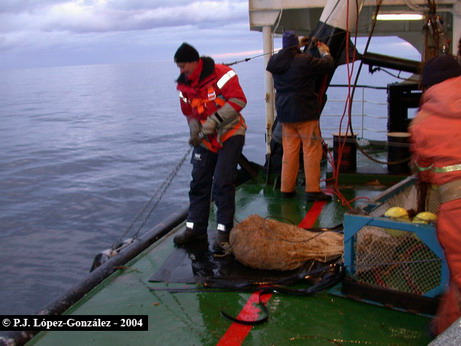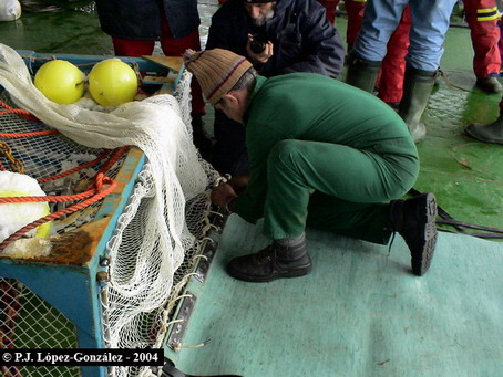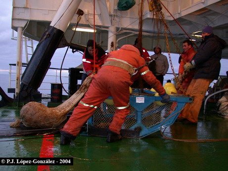 A la izquierda, Roberto Meloni, el jefe de expedición, controla las maniobras del trineo mientras es izado a la cubierta de trabajo. En esta operación participan al menos tres hombres de la tripulación, y -como podéis ver- en el interior de la red encontraremos todos los organismos capturados. El nudo de la red suele ser de rápida apertura, y los animales se vierten sobre la cubierta de trabajo, lugar donde se hará una primera separación del material más interesante, algo que continuará en el laboratorio con las lupas binoculares y los microscopios.