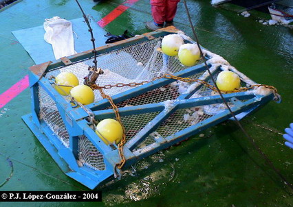 Trampas para peces Estas trampas para peces eran cebadas y fondeadas, al cabo de un tiempo eran recogidas para ver si habían conseguido atrapar algún pez que pudiera servir para los estudios abordo. |