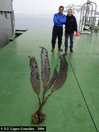 Arriba a la derecha vemos a Francesco que nos muestra el alga que ha recolectado, mientras Peter prepara un bidón para las muestras que se obtendrán con el trineo Rauschert. |