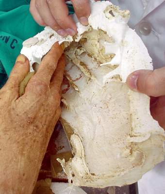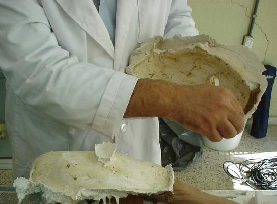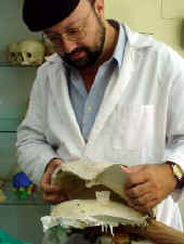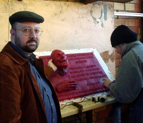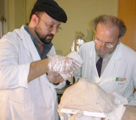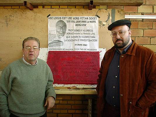 Junto al Catedrático de Anatomía Dr. D. José María Smith-Agreda, durante el proceso de la mascarilla y en la entrega de la misma a las autoridades académicas el 4 de Diciembre de 2000 a las 12.00 horas, en el Rectorado de la Universidad de Málaga, ante un tropel de periodistas. En la Fundición de Valencina (Sevilla), repasando la cera de la Placa Conmemorativa, con el Catedrático de Escultura Dr. D. Miguel Fuentes del Olmo, donde se incorporan las mascarillas para pasarlas a bronce.