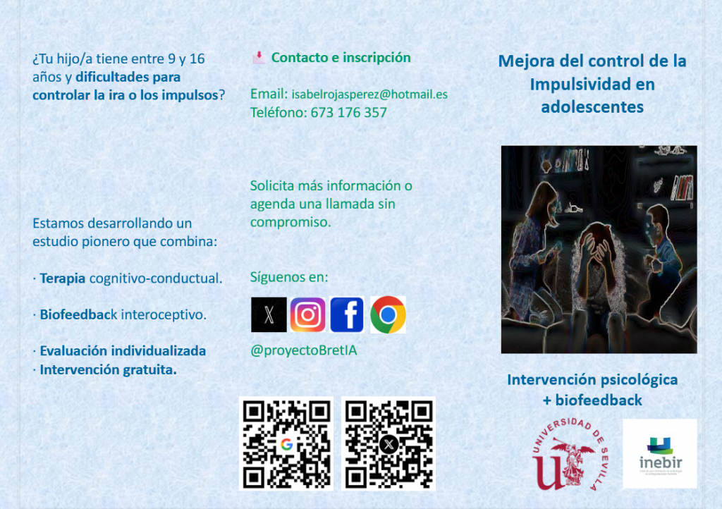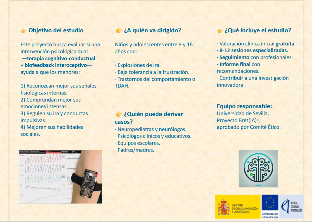 Las conductas impulsivas/agresivas suponen un grave problema para los niños y adolescentes a la hora de aprender a relacionarse con su entorno, así como una fuente constante de conflictos en sus familiares. El proyecto BRet(IA)2 («Biofeedback e Inteligencia Artificial para el control de la impulsividad en adolescentes» – PID2023-147508OB-I00) se centra en el uso de un sistema biofeedback (BF), junto con técnicas de IA, y terapias de exposición interoceptiva con el objetivo de ayudar a jóvenes con estas conductas a expresarse adecuadamente y evitar respuestas agresivas, mejorando su salud mental y su calidad de vida. De este modo, el proyecto presenta tres vertientes: