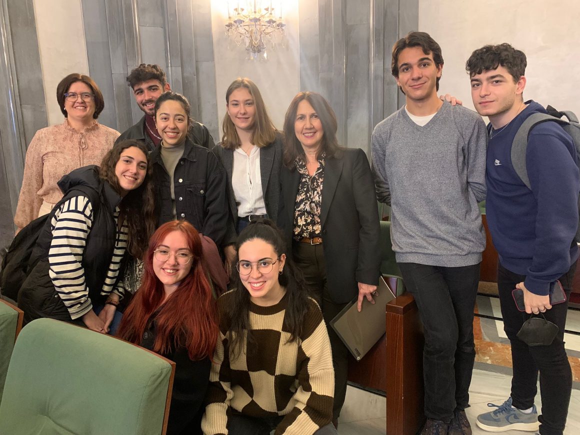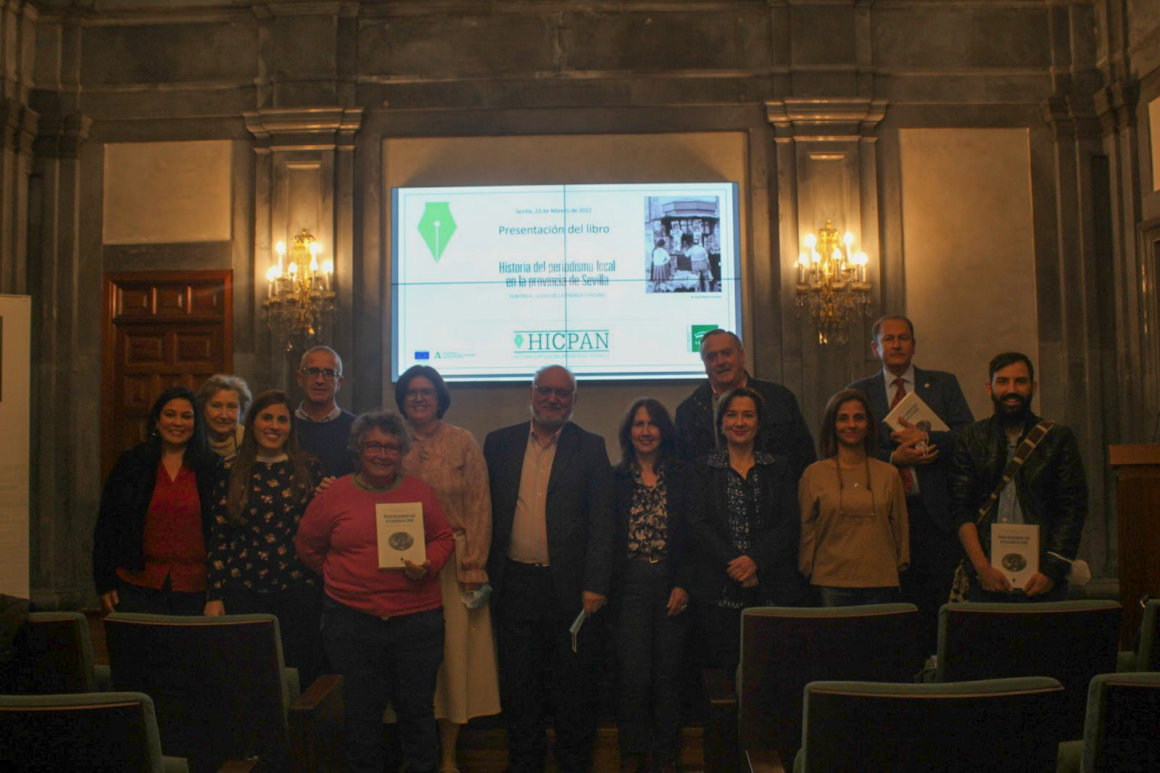 © Elena Carrasco. Las profesoras y responsables de la edición del libro, Carmen Espejo y Mª. del Carmen Montoya, con el grupo de alumnos/as del grado de Periodismo de la Universidad de Sevilla asistentes a la presentación del libro del proyecto HICPAN.