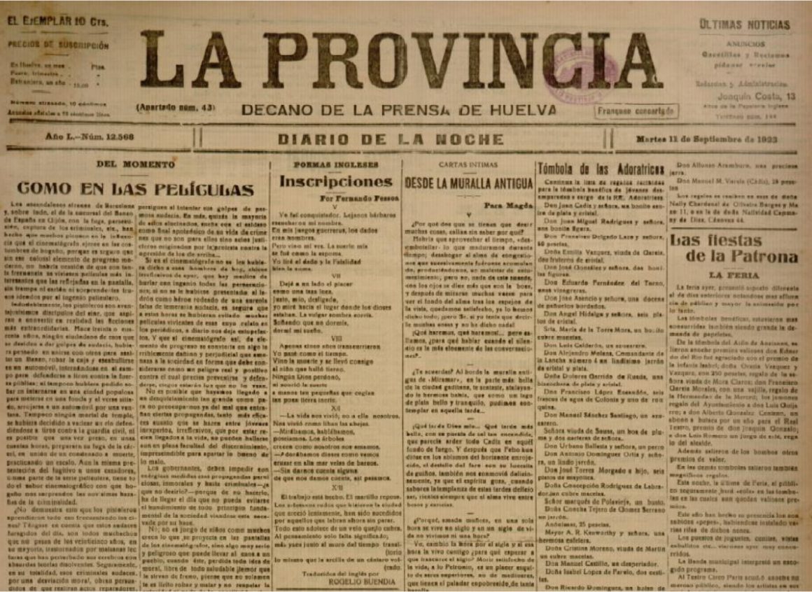 © El poema de Fernando Pessoa, traducido por Muñoz de Vargas, aparecía en la portada de La Provincia del 11 de septiembre de 1923. Fuente: AMH _ Hemeroteca (Fondo Díaz Hierro_ R. 00254). Archivo Municipal del Ayuntamiento de Huelva.