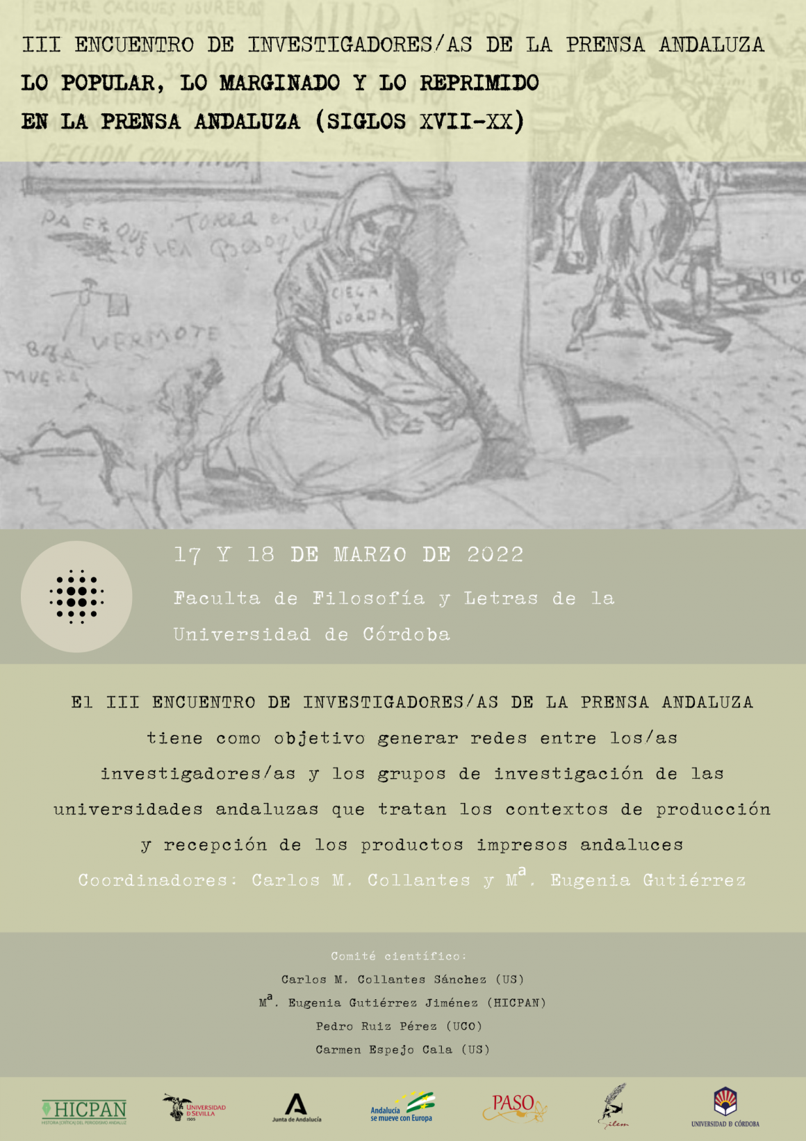 La III edición del Encuentro de Investigadores/as de la Prensa andaluza se centra en la temática de “Lo popular, lo marginado y lo reprimido en la prensa andaluza (siglos XVII-XX)” y pretende otorgar continuidad a la iniciativa del encuentro, iniciada en el año 2017, para generar redes de colaboración entre los grupos de investigación de las universidades andaluzas y los/as investigadores/as que trabajan sobre los contextos de producción y recepción de los productos impresos andaluces entre el siglo XVIII y el siglo XX. De esta forma, se intenta hacer dialogar la historia de la literatura y la historia de la comunicación para situar el estudio de los productos impresos andaluces en la historia cultural de Andalucía.