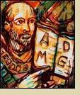 «saint Ignatius Loyola holding an open book and pointing to the words Ad Majorem Dei Gloriam in it;» (P 56)