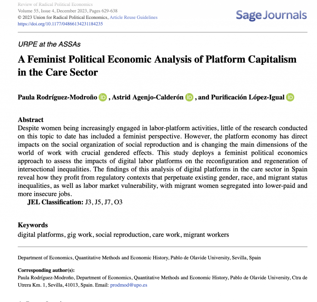 Rodriguez-Modroño, P.; Agenjo-Calderón, A.; López-Igual, P.2023. A Feminist Political Economic Analysis of Platform Capitalism in the Care Sector. Review of Radical Political Economics. Sage Journals. pp.1-10. https://doi.org/10.1177/04866134231184235