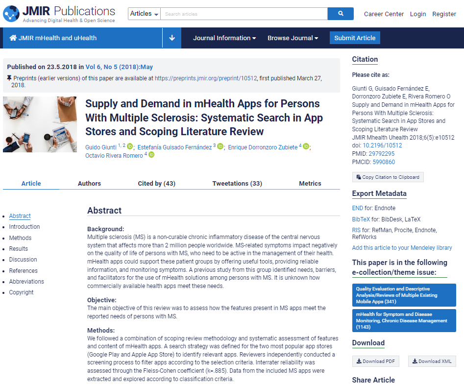 JMIR mHealth and uHealth | Supply and Demand in mHealth Apps for Persons with Multiple Sclerosis: Systematic Search in App Stores and Scoping Literature Review https://mhealth.jmir.org/2018/5/e10512/PDF
