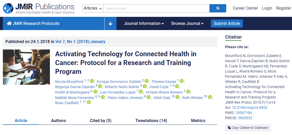 JMIR Research Protocols | Activating Technology for Connected Health in Cancer: Protocol for a Research and Training Program https://www.researchprotocols.org/2018/1/e14/PDF