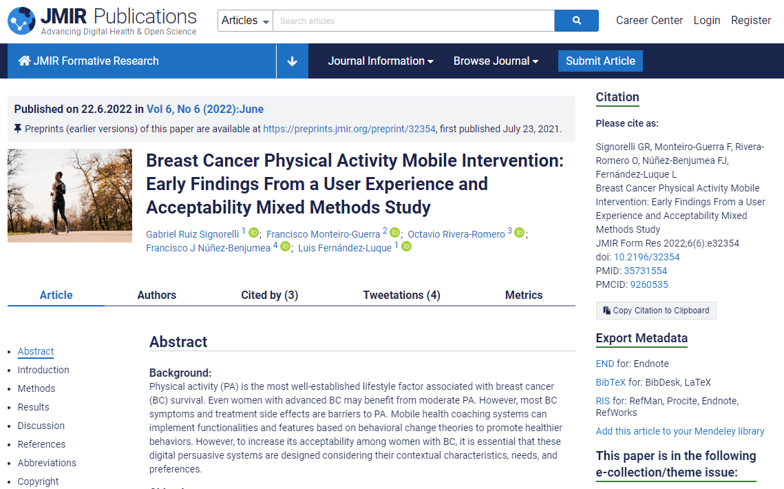 JMIR Formative Research | Breast Cancer Physical Activity Mobile Intervention: Early Findings From a User Experience and Acceptability Mixed Methods Study https://formative.jmir.org/2022/6/e32354/PDF