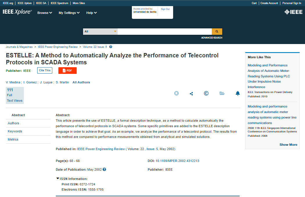 IEEE Power Engineering Review | ESTELLE: A METHOD TO AUTOMATICALLY ANALYZE THE PERFORMANCE OF TELECONTROL PROTOCOLS IN SCADA SYSTEMS https://ieeexplore.ieee.org/stamp/stamp.jsp?tp=&arnumber=4312213