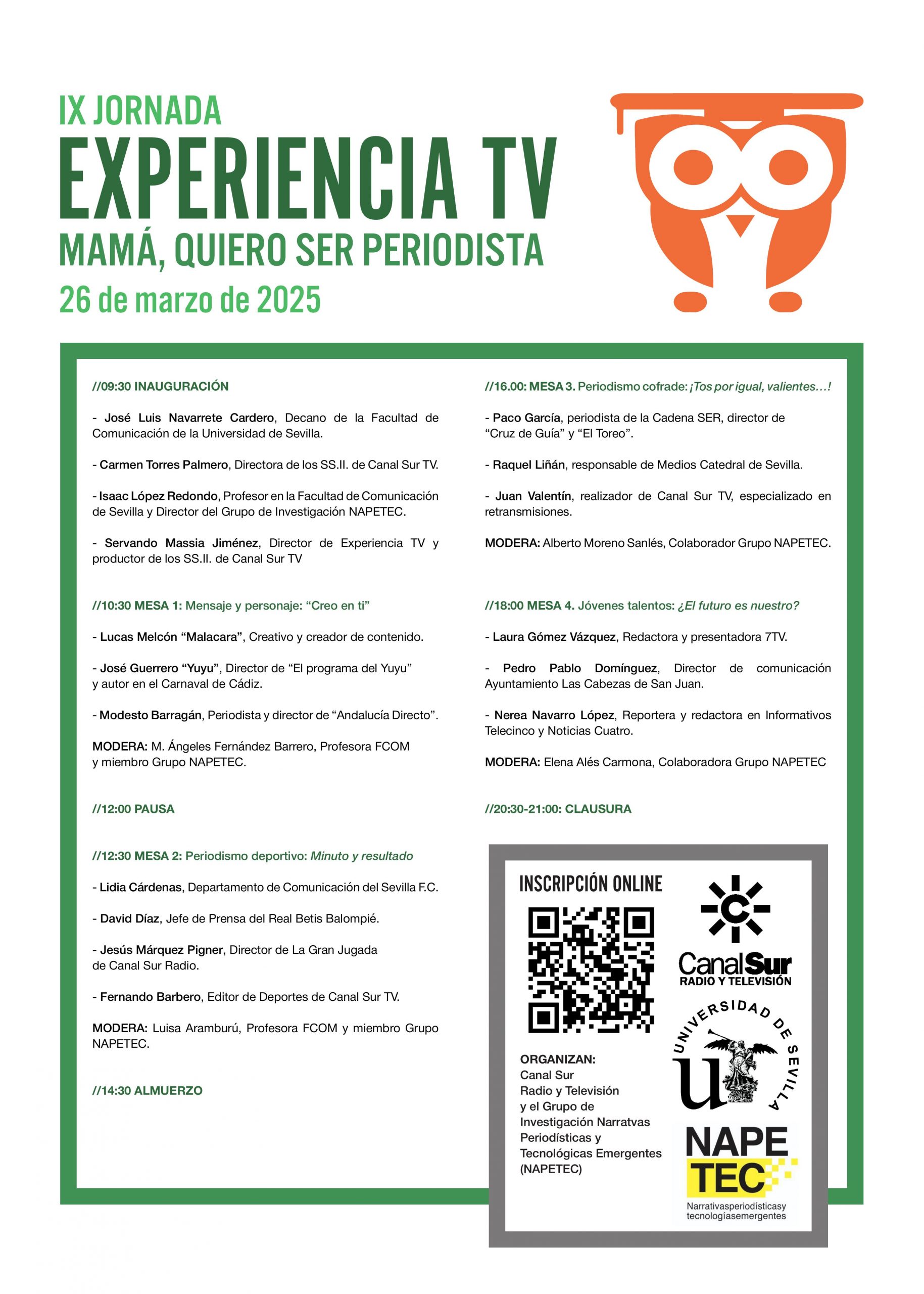 Esta jornada académica está especialmente dirigida a estudiantes de la Facultad de Comunicación y organizada por el Grupo de Investigación “Narrativas Periodísticas y Tecnologías Emergentes” (NAPETEC) y Canal Sur. La inscripción es completamente gratuita y se puede realizar online a través del QR impreso en el cartel del evento. Los asistentes, además, recibirán un certificado de aprovechamiento.