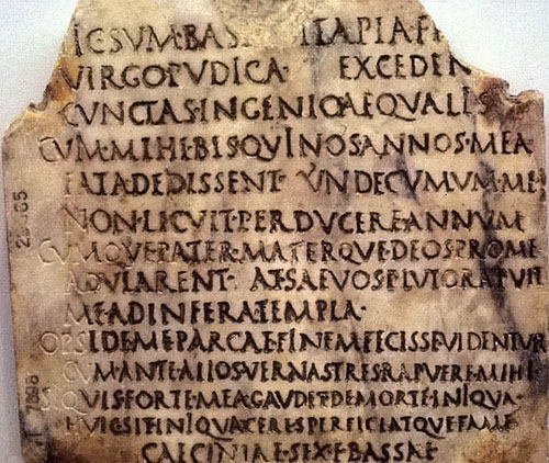 “Aquí estoy enterrada, Bassa, hija afectuosa, muchacha pudorosa, sobrepasando a todas mis semejantes en talento. Cuando el destino me había concedido diez años, no me fue permitido continuar el undécimo y, aunque mi padre y mi madre adulasen a los dioses por mí, sin embargo, el cruel Plutón me arrastró a las regiones infernales. Parece que las Parcas, siendo yo su prenda, han dispuesto mi fin, pues ya antes me arrebataron otros tres jóvenes esclavos. Si por casualidad alguien se alegra de mi muerte injusta, Ceres sea injusta con él y le haga morir de hambre. A Cecinia Bassa, hija de Sexto.”
