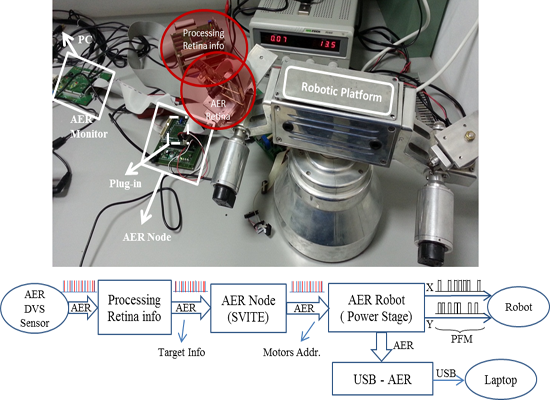 Next video shows a fully neuromorphic system, that uses spikes from sensor to motors.