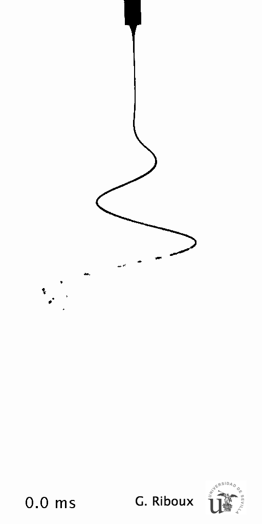 Ejemplo de movimiento del chorro en modo de whipping y la medida del la longitud de onda y de la frecuencia de la inestabilidad de whipping. G. Riboux et al. 2010 (El diametro externo del capillar es 0.5 mm)